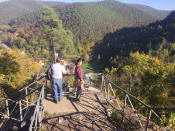 Einen wunderschönen herbstlichen Ausflug in die Pfalz hat unser Kollege Heinz-Eugen Mohr am 15. Oktober organisiert. Bei bestem Wetter wurden die Burgruinen Spangenberg und Erfenstein im Elmsteiner Tal besichtigt. Der Clou war die Anfahrt: Von Lambrecht aus fuhren wir mit der Dampflockbahn "Kuckucksbähnel" zum Forsthaus Breitenstein. Von dort wurde zur Burg Spangenberg gewandert. Das Mittagessen gab es in der dortigen Burgschänke, danach wußte ein Mitglied des Burgvereins bei einer Führung viel Interessantes über die aus dem 11. Jahrhundert stammende Burg zu berichten.