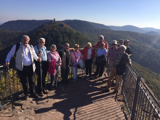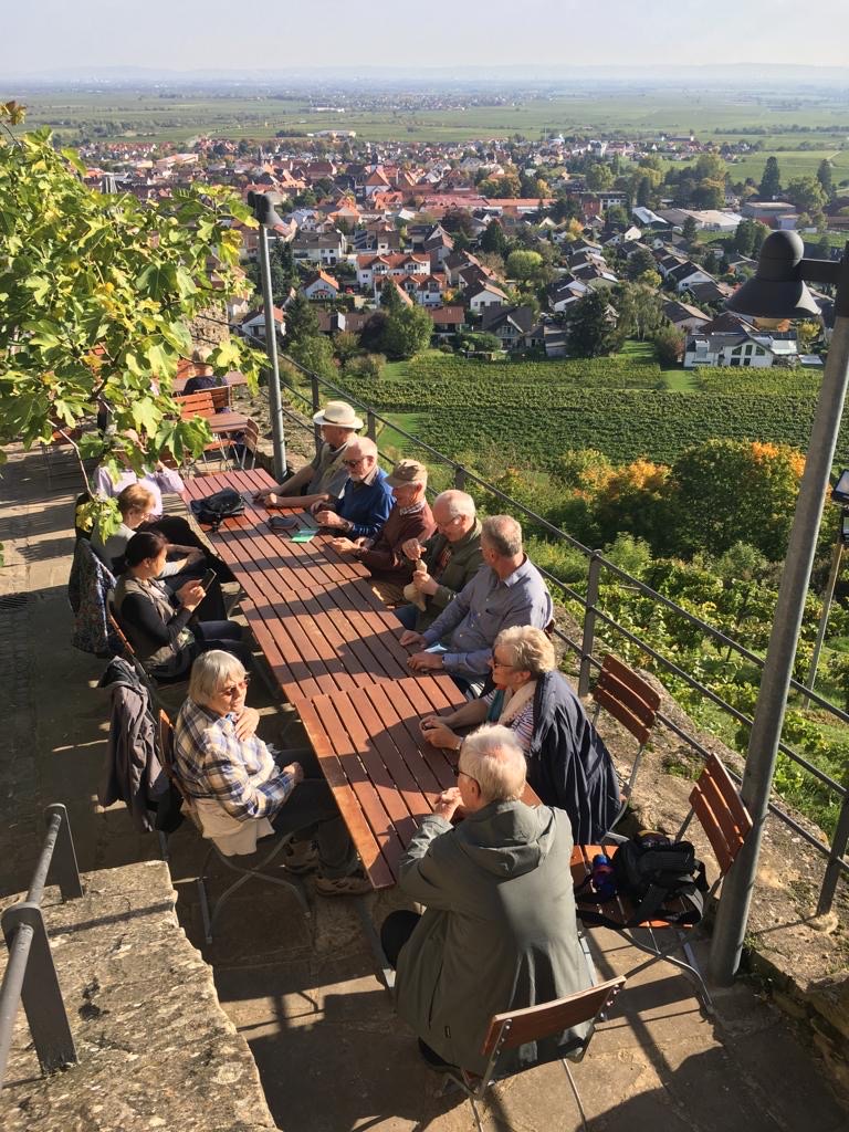 Am 13. Oktober fand bei strahlendem Sonnenschein unser diesjähriger Ausflug in der Pfalz statt. Von Wachenheim ging es mit einer kleinen Wanderung durch Wald und Weinberge zur Burgruine Wachtenburg. Dort wurde das Mittagessen eingenommen und die Burg erkundet. Vom Burgturm gab es eine fantastische Rundum-Aussicht. Nächster Höhepunkt war die Sektkellerei Wachenheim mit fachkundiger Führung durch die Kellerei und einer Sektprobe. Der Abschluss fand bei Kaffee und Kuchen im Café Schellack statt. Dank gebührt Heinz-Eugen Mohr für die perfekte Organisation des Tages!