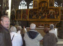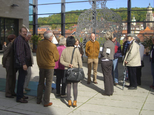 Beim Ausflug nach Schwäbisch Hall am 28. September strahlte die Sonne vom Himmel. 16 Teinehmer erkundeten in einer 90-minütigen Stadtführung die Stadt, beginnend bei der "Henkersbrücke" über die engen Gassen der Altsdtadt bis zur prächtigen Stiftskirche Sankt Michael mit dem berühmten Riemenschneider-Altar. Das Mittagessen wurde im Hotel Goldener Adler direkt am Marktplatz eingenommen. Am Nachmittag folgte eine Führung durch die Kunsthalle Würth, die sich sowohl der Architektur des Gebäudes als auch der aktuellen Austellung "Von Kopf bis Fuß. Porträts und Menschenbilder" widmete.